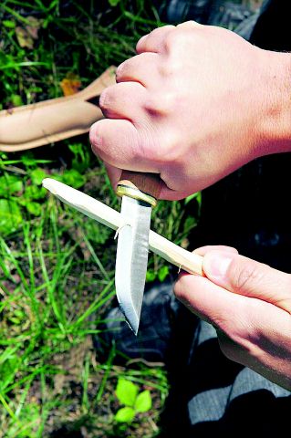 vuolupuukko Tällaisia vimpaimia ei ole paljon, mutta jonkun verran kuitenkin: sakset, kirves ja tietenkin puukko. Puukko on ollut vuosisatojen ajan niin muuttumaton ja tehokas vimpain, että kuvittelin sen pysyvän vastakin samanlaisena kahvan ja terän yhteenliittymänä. Olin väärässä. Puukon voi nimittäin ajatella uusiksi, ja kaiken kukkuraksi aiempaa paremmaksi. Keksijä Reijo Vierimaan Vuolija-puukon tunnistaa ensinäkemältä puukoksi, mutta ihan uudenlaiseksi. Vuolijan terä on nimittäin kiinnitetty kahvaan ihan kummallisesti. Kun perinteisessä puukossa kahva ja terä ovat suorassa linjassa, Vierimaan puukossa terä on noin viidentoista asteen kulmassa ylöspäin. Ihan kuin kysymyksessä olisi tekovirhe, mutta kaikkea vielä. Kulma on tarkkaan harkittu, ja sillä on tärkeä merkitys käyttöominaisuuksiin. Tiedän mistä puhun, sillä minulle on vuosien myötä kertynyt yli 60 erilaista puukkoa, joilla olen kaikilla vuollut. Vuolija on ehdottomasti paras vuolupuukko, jota olen kädessäni pitänyt. Lastu lähtee pitkänä, paksuna ja kaiken kukkuraksi vielä kevyesti. Sillä vuoleminen on yksinkertaisesti nautinto. Erityiskiitoksen ansaitsee tuppi, joka ei osoita suoraan alaspäin, vaan pikemminkin alaviistoon. Puukko on koko ajan kätevästi käsillä, mutta ei ole turhaan tiellä.
